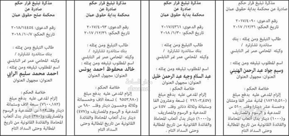 القاعدة إذا تعذر استدعاء المدعى عليه ورجع الإستدعاء بعبارة مجهول العنوان وقع استدعاؤه بالبريد المضمون. بعد أن يتم تسجيل الدعوى يتم تحرير تبليغ المدعى عليه مع نسخة من عريضة الدعوى وعند تبليغه تترك له فرصه ممكنة هذه الفرصه يجب أن تتناسب مع أمكانيته من أجل مراجعة هذه الدعوى حتى يستطيع توكيل محامي يمكن أن يتقدم للدفاع عنه. بقدر عدد المدعى عليهم و قائمة بتلك المستندات لغرض علم و تبليغ كل واحد منهم بموجبات عريضة الدعوى ويجب ان يوقع المدعي على كل ورقة مع اقراره بمطابقتها للأصل. تبليغ المدعى عليه مجهول العنوان أخبار اقتصادية.
